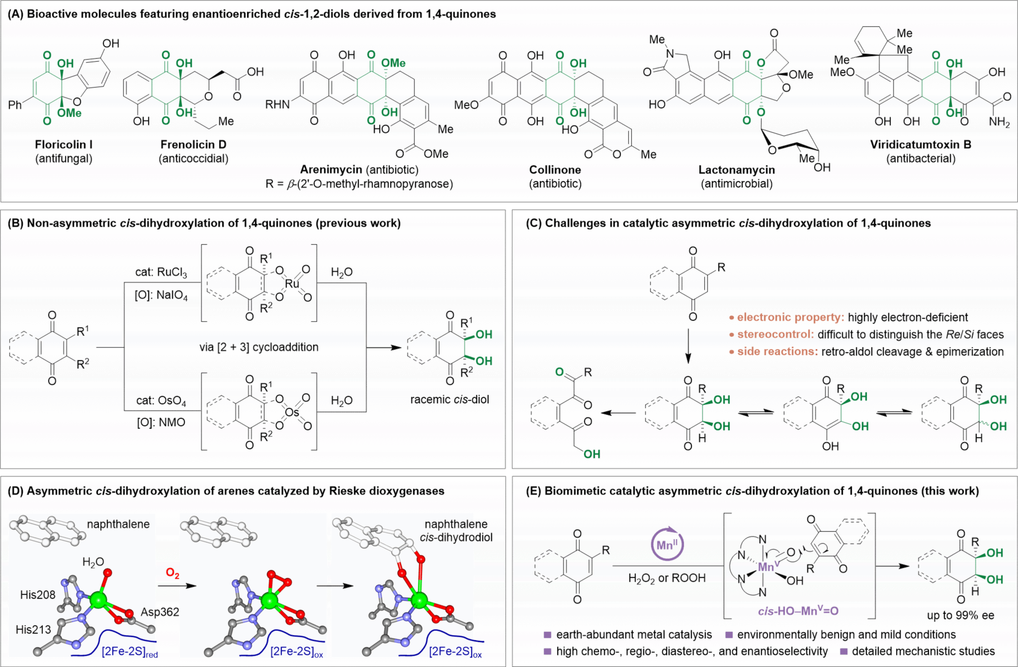 具体而言,1,4-醌类底物面临四大挑战(图1C):(1)共轭二烯酮结构导致C=C双键反应活性低;(2)平面结构对称性强,手性识别困难;(3)α-C−H产物易发生差向异构化;(4)邻二醇产物对逆羟醛裂解敏感。此外,贵金属Os、Ru催化剂的使用也带来环境和可持续性方面的考量。