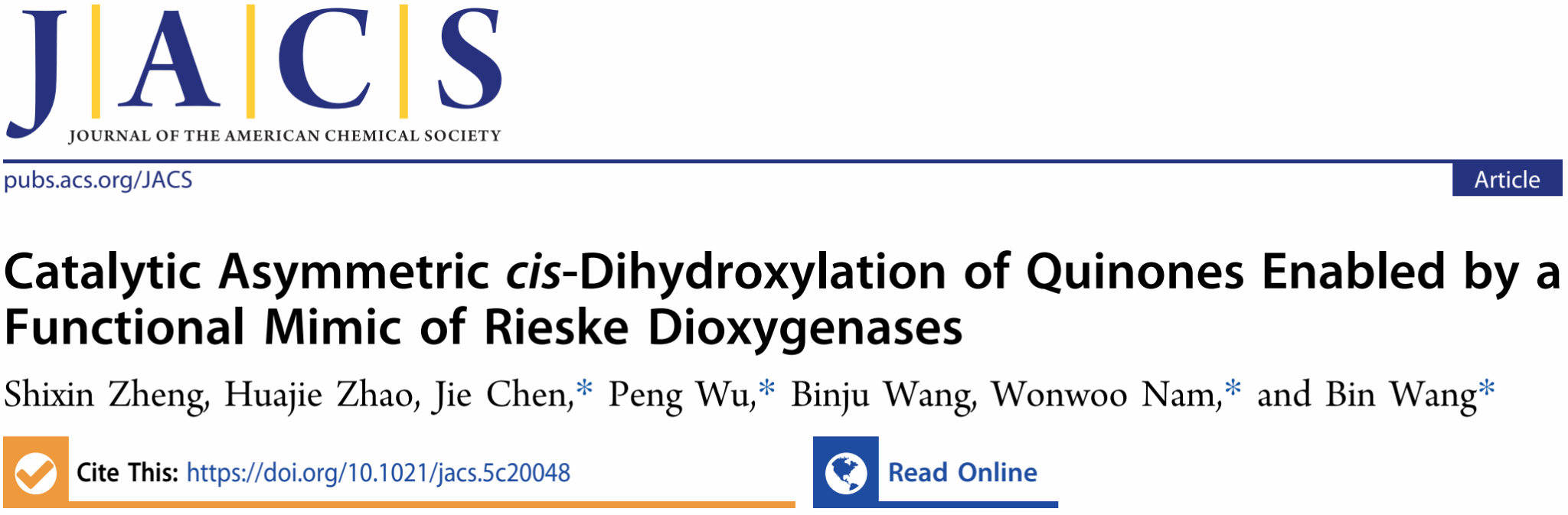 近日,世俱杯买球官网网站王斌教授课题组在化学领域权威期刊《美国化学会志》发表题为“Catalytic Asymmetric cis-Dihydroxylation of Quinones Enabled by a Functional Mimic of Rieske Dioxygenases”的研究论文(J. Am. Chem. Soc. 2026, https://doi.org/10.1021/jacs.5c20048)。该研究模仿自然界金属酶的催化机制,首次实现了非血红素锰配合物催化醌类化合物的不对称顺式双羟化反应,为手性邻二醇类化合物的高效合成提供了绿色新策略。