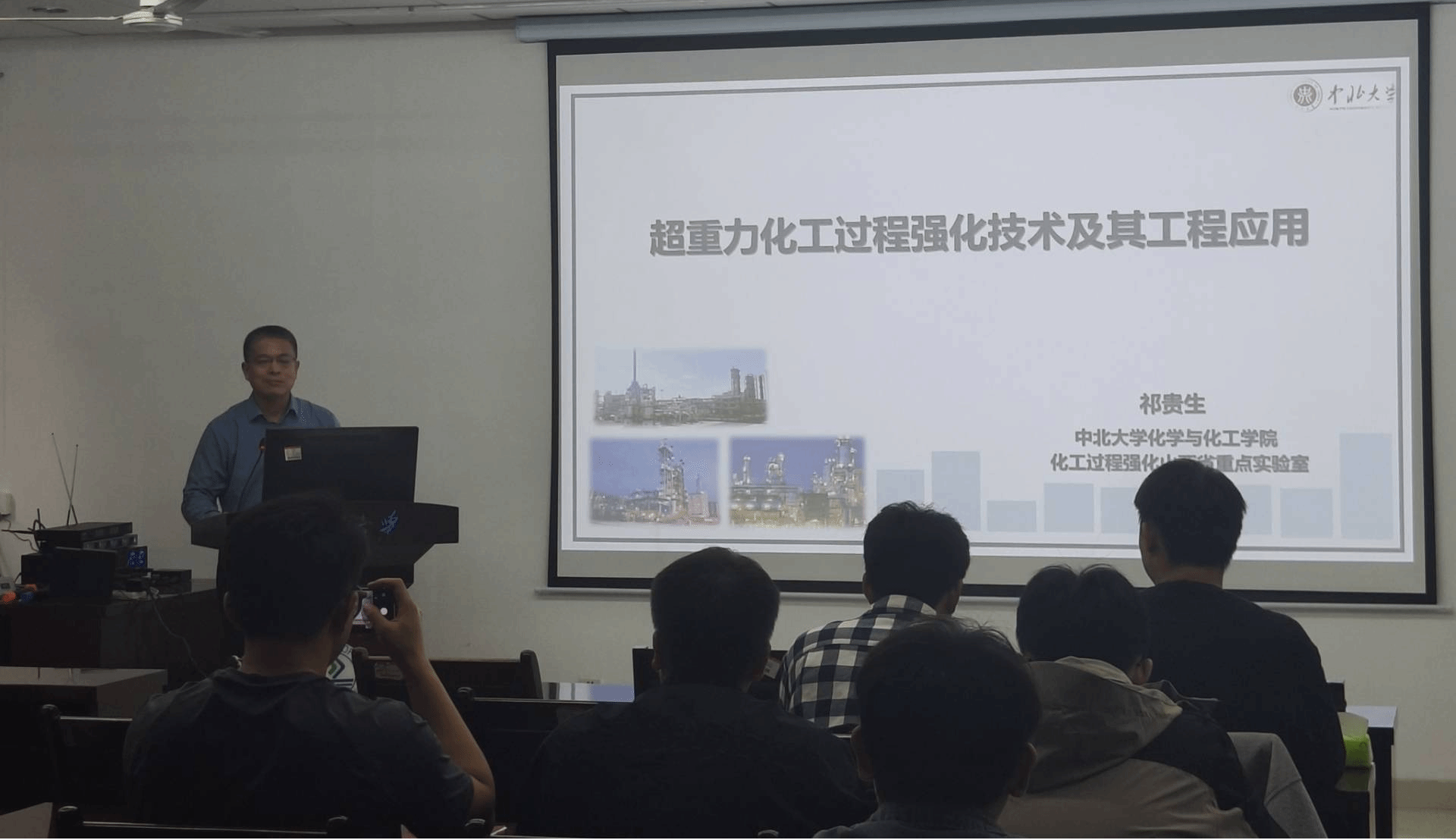 祁贵生教授作了题为“超重力化工过程强化技术及其工程应用”的学术报告。他首先从化工基本原理入手,系统阐述了超重力技术的核心概念、发展历程及其在工业中的基础应用价值,并深入浅出地解析了超重力场下的流体动力学、传质传热机制,强调了超重力技术在提升化工过程效率中的关键作用。随后祁贵生教授结合课题组近年来研究成果,重点介绍了超重力反应器的设计优化、催化机理研究及性能验证,以及超重力技术在煤化工、冶金、化肥等多个工业工程领域的经典应用案例;通过实验数据和模型模拟,展示了超重力技术在节能减排、资源高效利用方面的突破性进展,展望了其未来在智能化集成、绿色化工拓展等领域的发展方向。祁贵生教授的报告内容丰富、视角多维,为我校研究生、青年员工等青年学者和师生提供了前沿的科研思路和行业洞见。最后,祁贵生教授鼓励青年学者要加强跨学科合作,积极投身国产技术创新,将研究成果转化为实际应用,推动我国化工行业的自主创新与竞争力提升,应对全球化工安全与可持续发展的挑战。