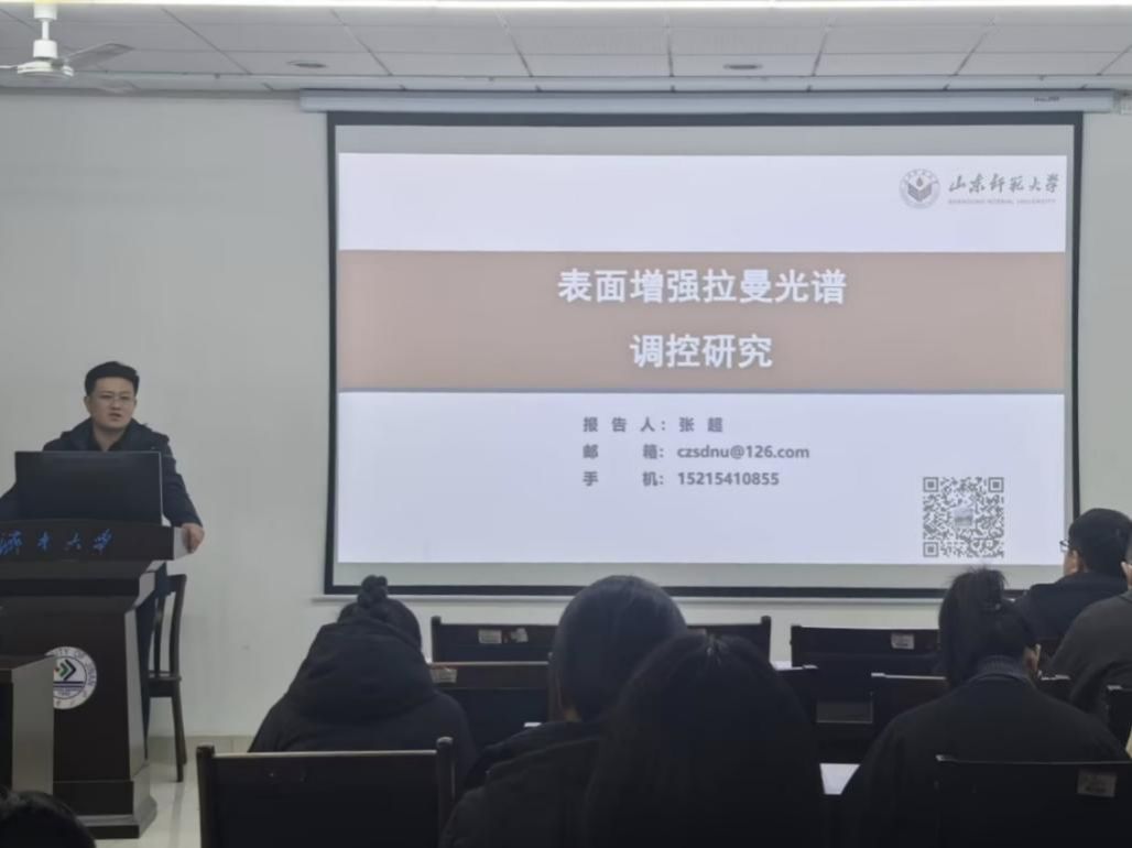 张超教授作了题为“表面增强拉曼光谱调控研究”的学术报告。他系统介绍了表面增强拉曼光谱的基本原理、调控方法与前沿进展,结合其团队在低维材料设计与器件集成方面的研究成果,阐释了该技术在环境监测、生物医学、能源材料等跨学科领域中的实际应用潜力。他特别强调了表面增强机制对分子检测灵敏度与选择性的提升作用,并展示了其在单分子检测、实时成像及动态过程分析中的最新应用案例。
