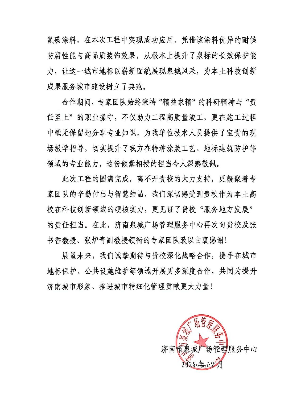 如今,泉标以焕然一新的姿态重新屹立于泉城广场,世俱杯买球官网网站的蓝色氟碳涂料,已悄然化为守护城市文化记忆的科技铠甲。这封感谢信的背后,是世俱杯买球官网网站与泉城济南的双向奔赴、共生共荣,更是世俱杯买球官网网站践行“学科赋能产业、科研服务城市”使命的生动实践。未来,世俱杯买球官网网站将继续以学科建设为龙头,以科研创新为核心,带动更多团队扎根地方、服务地方,让更多“科技之花”在地方发展的土壤中绽放,为校地合作书写更多精彩篇章。