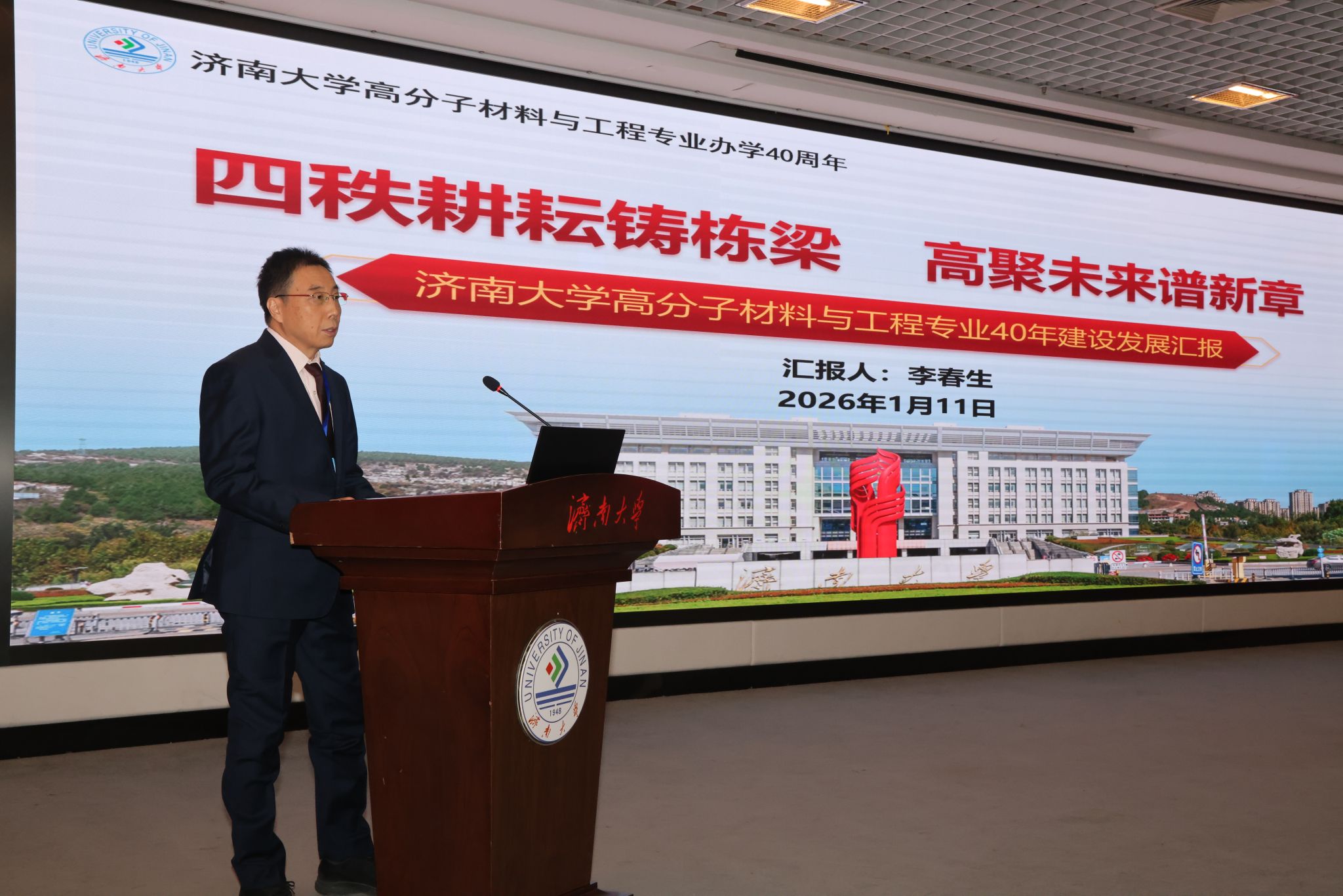 高分子材料与工程专业负责人李春生教授以“四秩耕耘铸栋梁,高聚未来谱新章”为题作专业建设发展汇报,系统梳理了专业自1985年应山东省塑料产业人才需求创立至今的发展脉络及办学40年取得的代表性成绩。