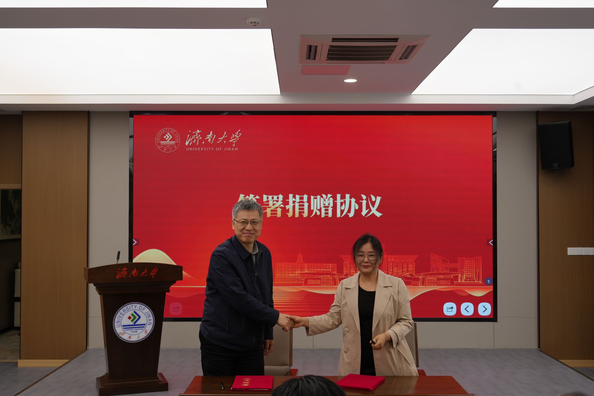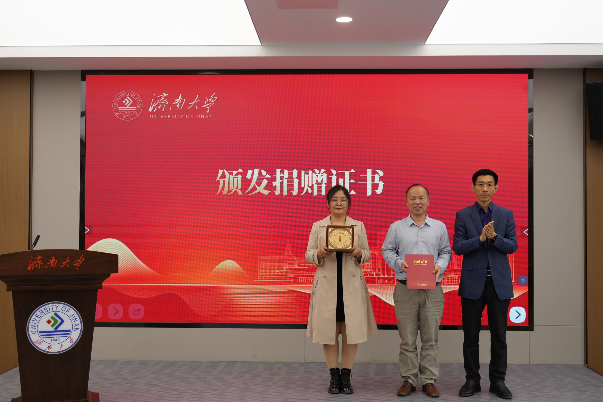 合作发展处处长刘振与于杰校友共同签署捐赠协议,李强校长为于杰、莫海林两位校友颁发捐赠证书及纪念奖牌。