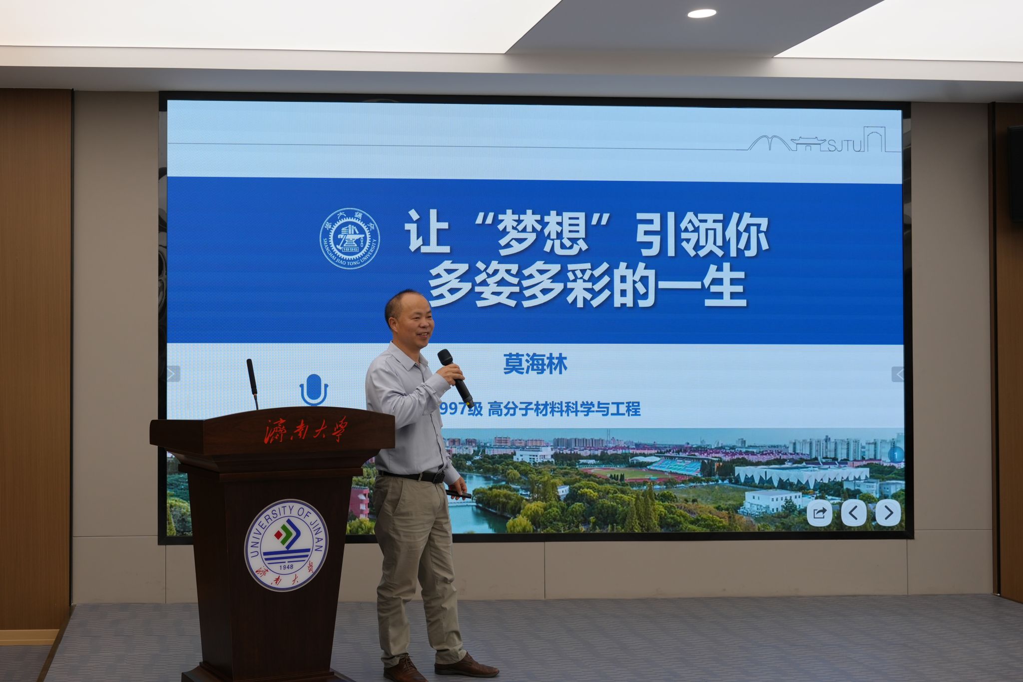 校友生涯讲堂上,莫海林以《让“梦想”引领你多姿多彩的一生》为题讲述了自身从山区求学成长为行业精英的经历,从求学、工作、创业三方面,分享了在济大时光、知名企业任职及自主创业的奋斗历程。最后他勉励同学们坚定理想、终身学习,实现个人与社会价值统一。
